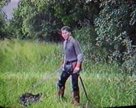 Gereitzt hebt Günther einen schweren, mächtigen Ast auf, der am Wegesrand liegt.
